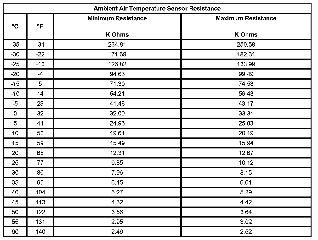 The following table will be used to measure the resistance of the sensor and compare it with the actual ambient temperature. The mirror temperature accuracy should be within 5 degrees of the actual temperature. The actual temperature should not be taken from a radio station, a sign displaying the temperature, etc. A temperature measuring tool such as a thermometer should be used. Some temperature measuring tools may be within 5 degrees of the actual temperature. Make sure to consult the manufacturer for the accuracy of the tool. This comparison can make the mirror seem off by 5-10 degrees of the actual temperature when it is not.