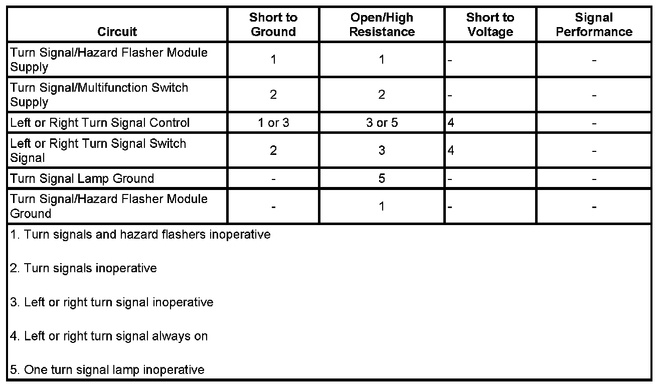 ^ If the test lamp is always OFF, test the control circuit for a short to ground or an open/high resistance. If the circuit tests normal, replace the turn signal/hazard flasher module.