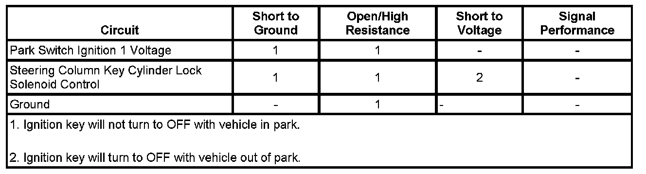 ^ If the test lamp is always OFF, test the control circuit, and the park switch accessory voltage circuit for a short to ground or open/high resistance. If the circuits test normal, test or replace the park switch.