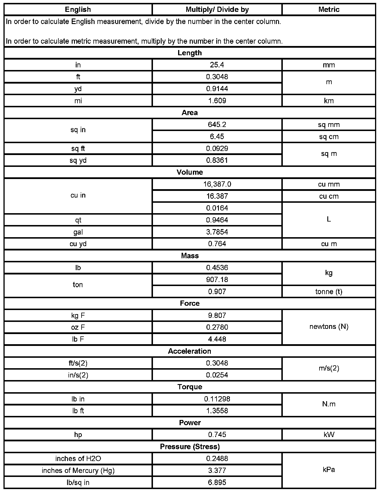 US English/Metric Conversion