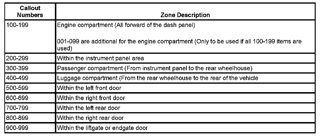 All grounds, in-line connectors, pass-through grommets, and splices have identifying numbers that correspond to where they are located in the vehicle. The following table explains the numbering system.