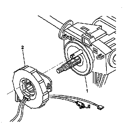 4. Align the inflatable restraint steering wheel module coil (2) with the horn tower sticking through the shaft lock or cam orientation plate (1).