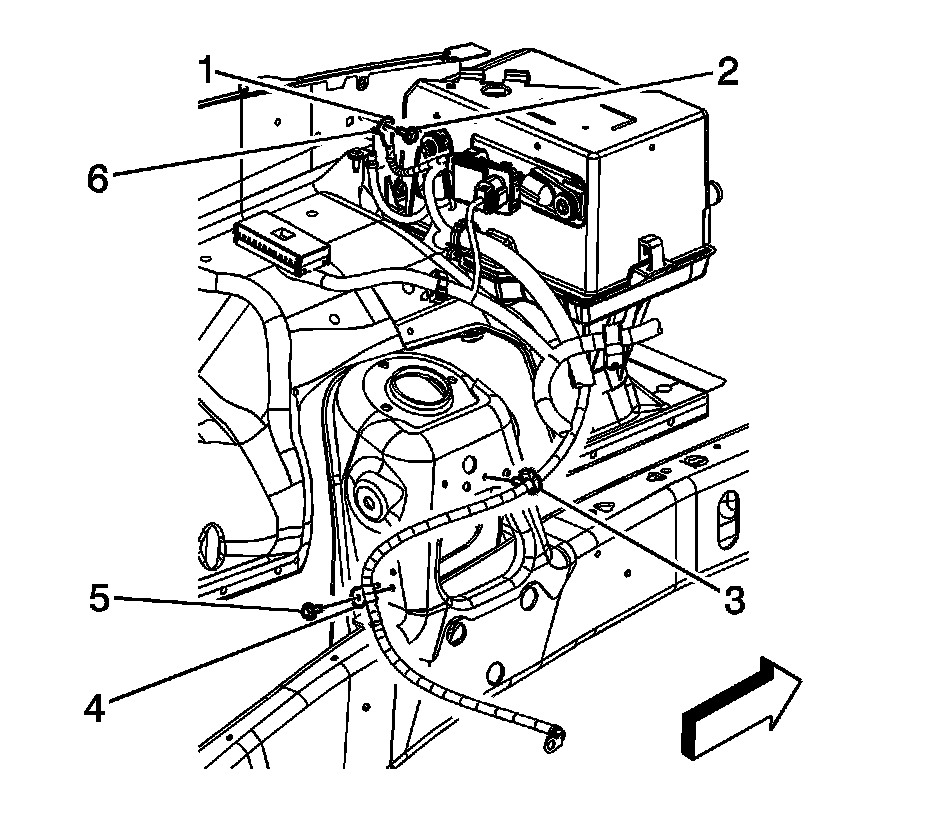 6. Install the negative battery cable ground terminal (1) to the left wheelhouse panel. Ensure that the anti-rotation tab (6) is inserted into the hole in the wheelhouse panel.