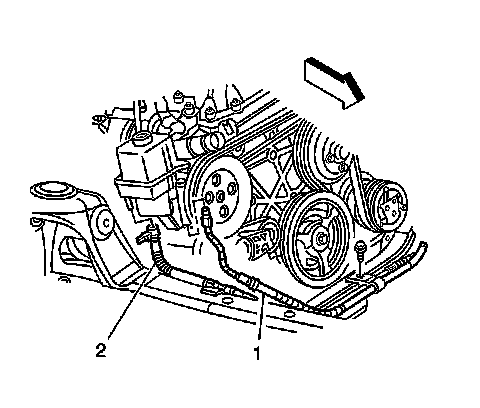 7. Disconnect the power steering pressure hose (1) and power steering cooler hose (2) from the power steering pump.