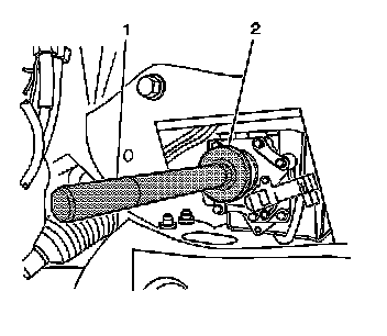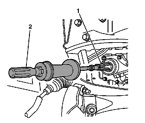 3. Install the J 29369-2 (1) and the J 6125-B (2) into the outboard, wheel drive shaft side, oil seal as shown.