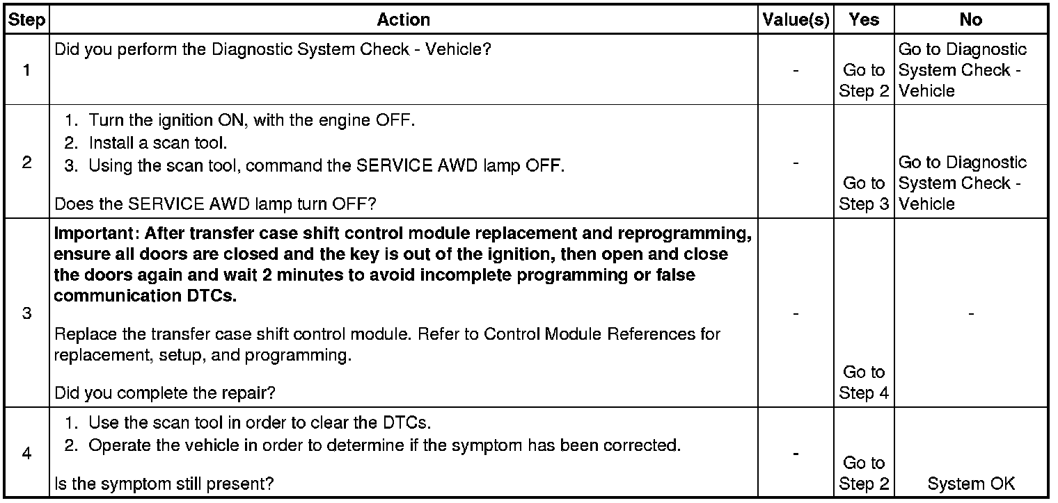 The SERVICE AWD indicator is located in the instrument cluster and shares the instrument cluster common power and ground. The transfer case shift control module controls the SERVICE AWD indicator by sending the instrument cluster a Class 2 message. This lamp may be controlled with the scan tool using the instrument cluster device controls.