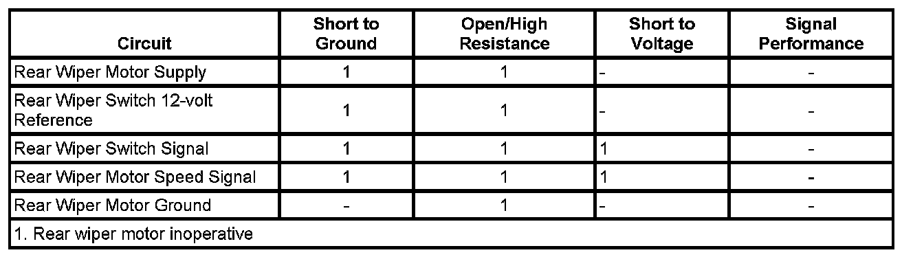The rear wiper motor is supplied battery positive voltage and ground. The liftgate control module controls rear wiper motor operation through the rear wiper motor speed signal circuit. The rear wiper motor speed signal circuit is supplied a battery positive reference voltage by the rear wiper motor module and is pulse width modulated to ground by the liftgate control module. The duty cycle of the pulse width modulation (PWM) determines the rear wiper motor operating mode.