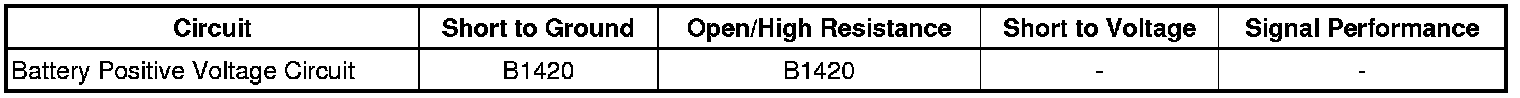 The body control module (BCM) monitors the battery voltage through the battery voltage signal circuit. If the BCM senses that battery voltage is outside of its normal range, DTC B1420 will set. Damage to components, and incorrect data may occur when the voltage is out of range.
