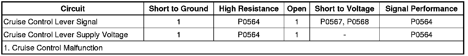• If not the specified value, test the signal circuit terminal 1 for a short to ground or an open/high resistance. If the circuit tests normal, test or replace the cruise control lever.