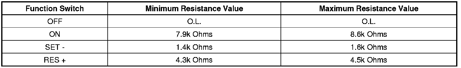 Important: The cruise control switch must be ON in order to properly measure the resistance of the set/cruise and the resume/accel switches.