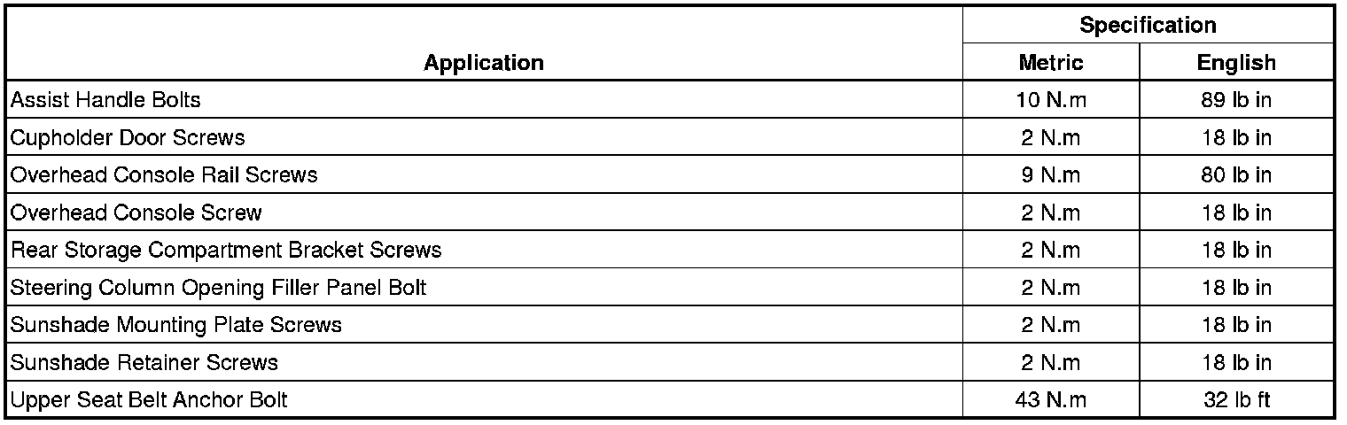 Interior Trim and Paneling - Fastener Tightening Specifications