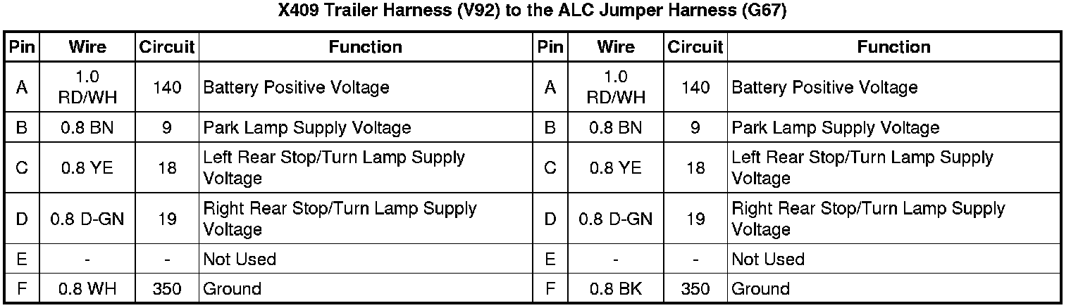 X409 Trailer Harness (V92) to the ALC Jumper Harness (G67)