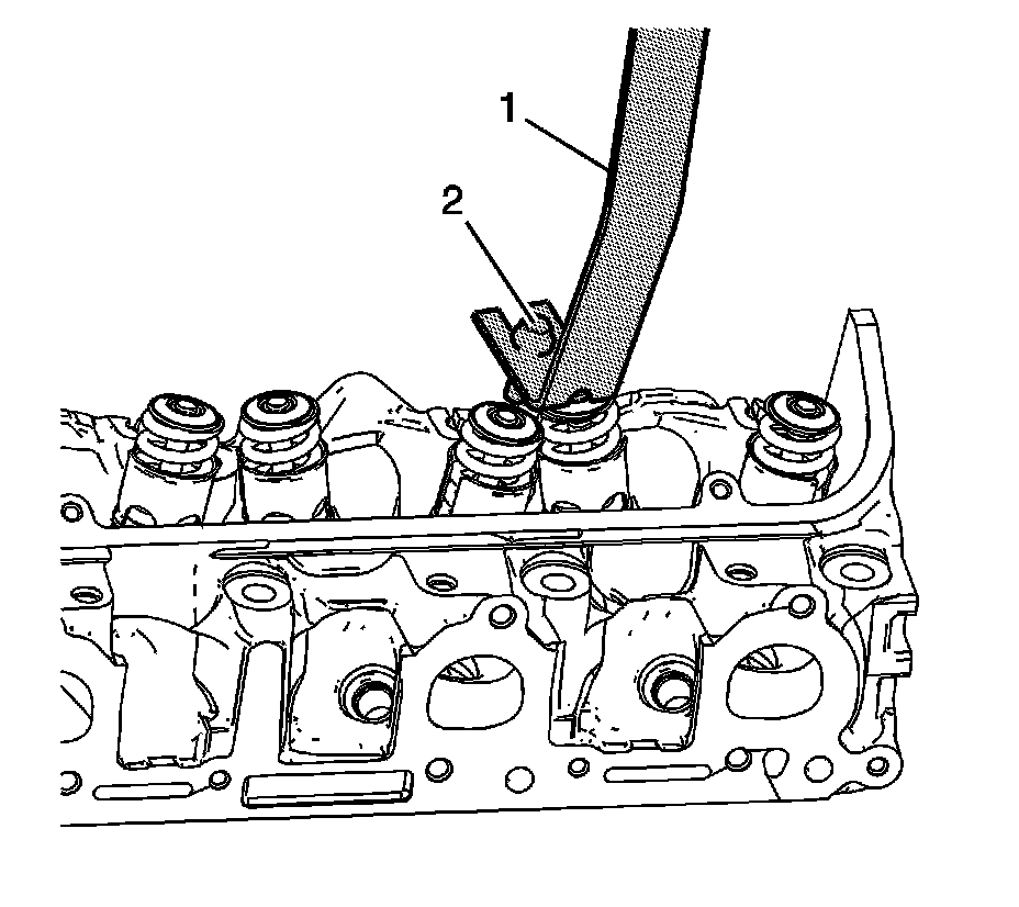 3. Using caution so as not to damage the valve spring or valve spring dampener, compress the valve springs using the J 5892-D (1) and theEN-47823 (2).