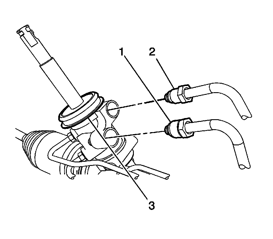 11. Disconnect the power steering gear inlet hose (1) and the power steering cooler hose (2) from the steering gear (3). Discard the O-ring seals.