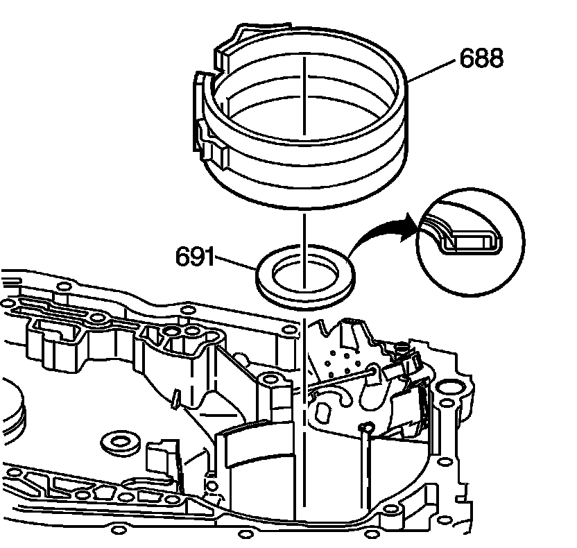 4. Install the bearing (691) for the differential carrier internal gear into the case. Position as indicated.