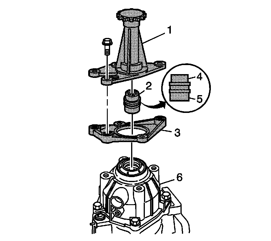 Important: The toolJ 26958-10B (2) is model specific and can be used on a standard duty and a heavy duty transmission. This tool has a small end (4) and a larger end (5). Standard duty would use the smaller end (4) facing down, and a heavy duty would use the larger end (5) facing down.