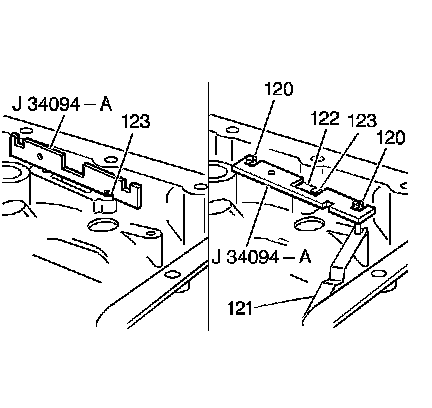 5. UseJ 34094-A in order to set the height of the thermo element plate pin (120) that is farthest from the accumulators.