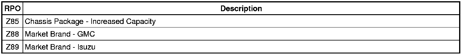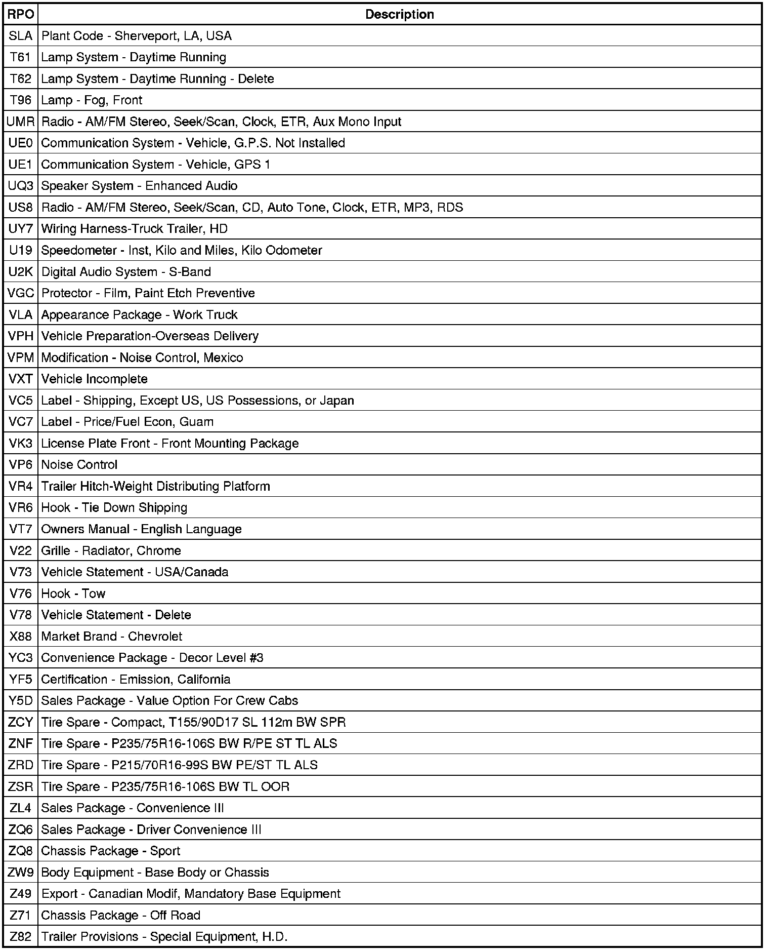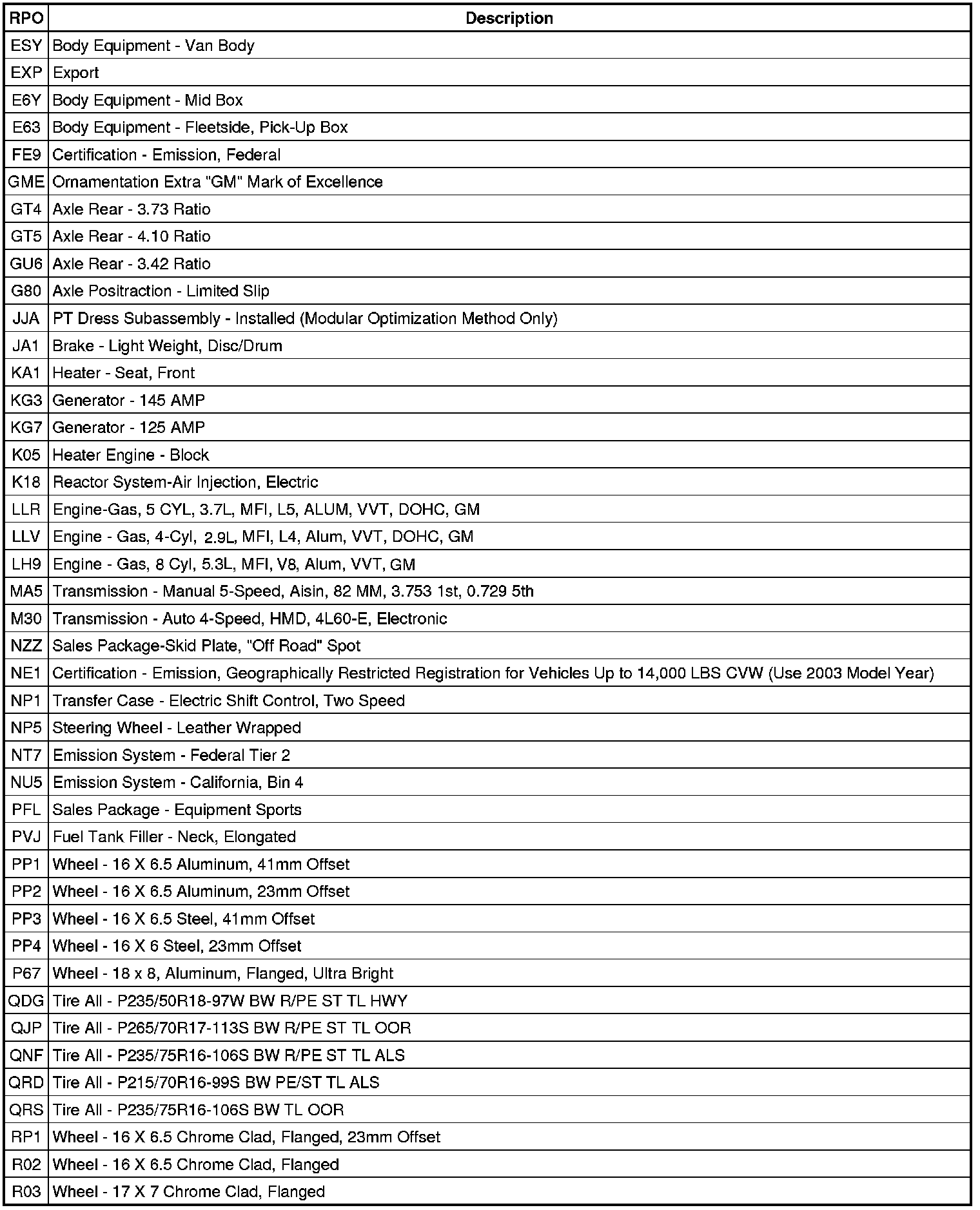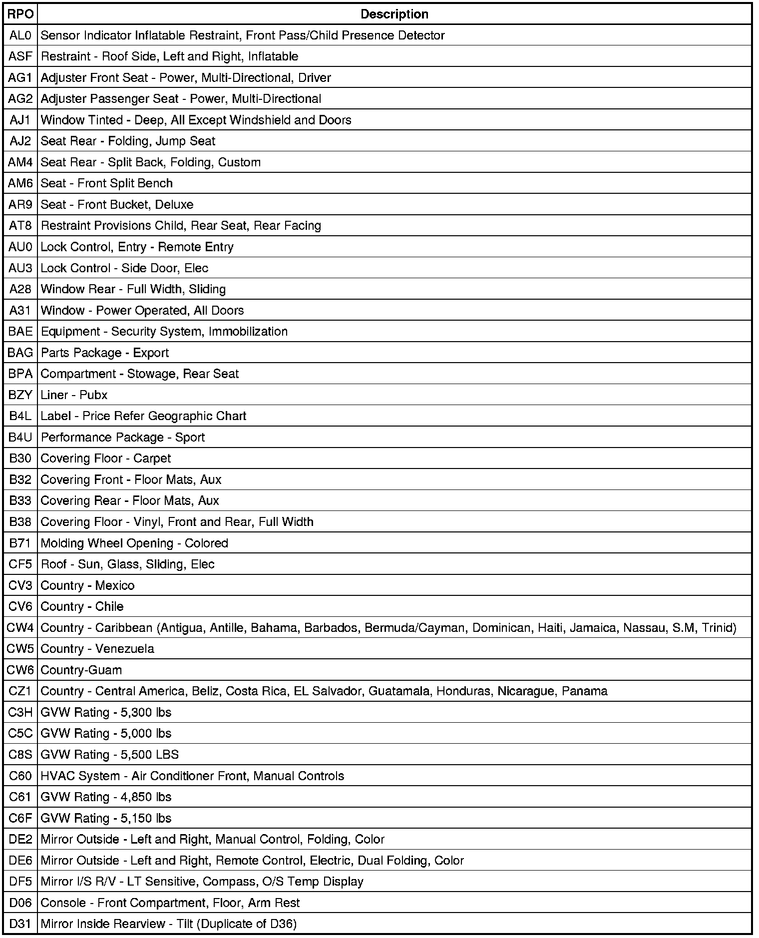 RPO Code List