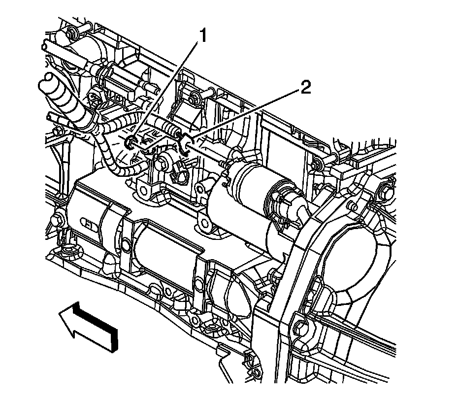 14. Remove the starter terminal nut (1) and remove the positive battery cable terminal (2) from the starter.
