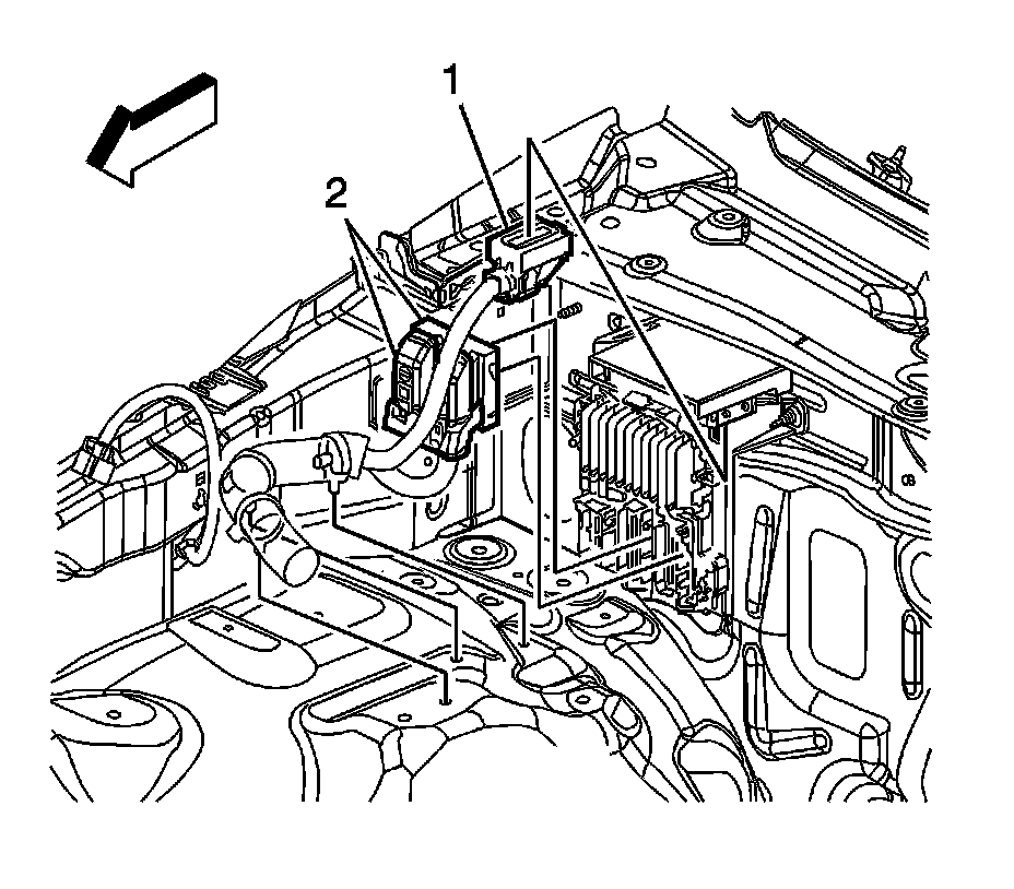 7. Lift up the ECM bracket tabs (2) and tilt the ECM (1) towards the front of the vehicle, removing the ECM (1).