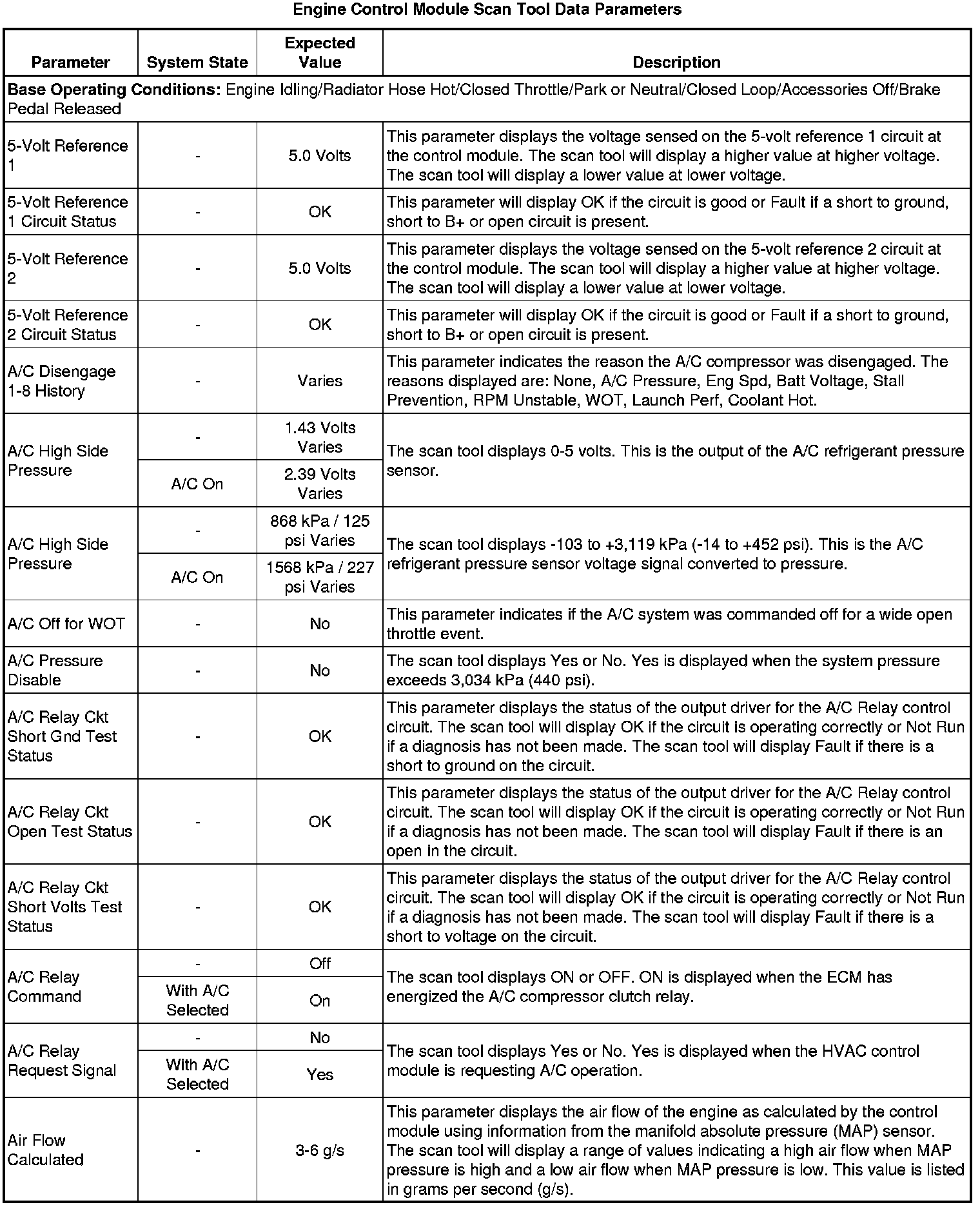 The Engine Control Module Scan Tool Data List contains all engine-related parameters that are available on the scan tool. The list is arranged in alphabetical order. A given parameter may appear in any one of the data lists, and in some cases may appear more than once, or in more than one data list in order to group certain related parameters together.