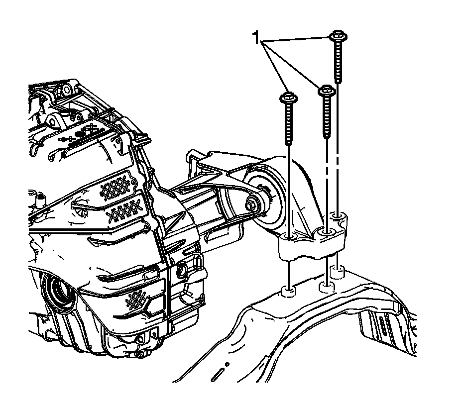 14. Remove the rear transmission mount to frame bolts (1).