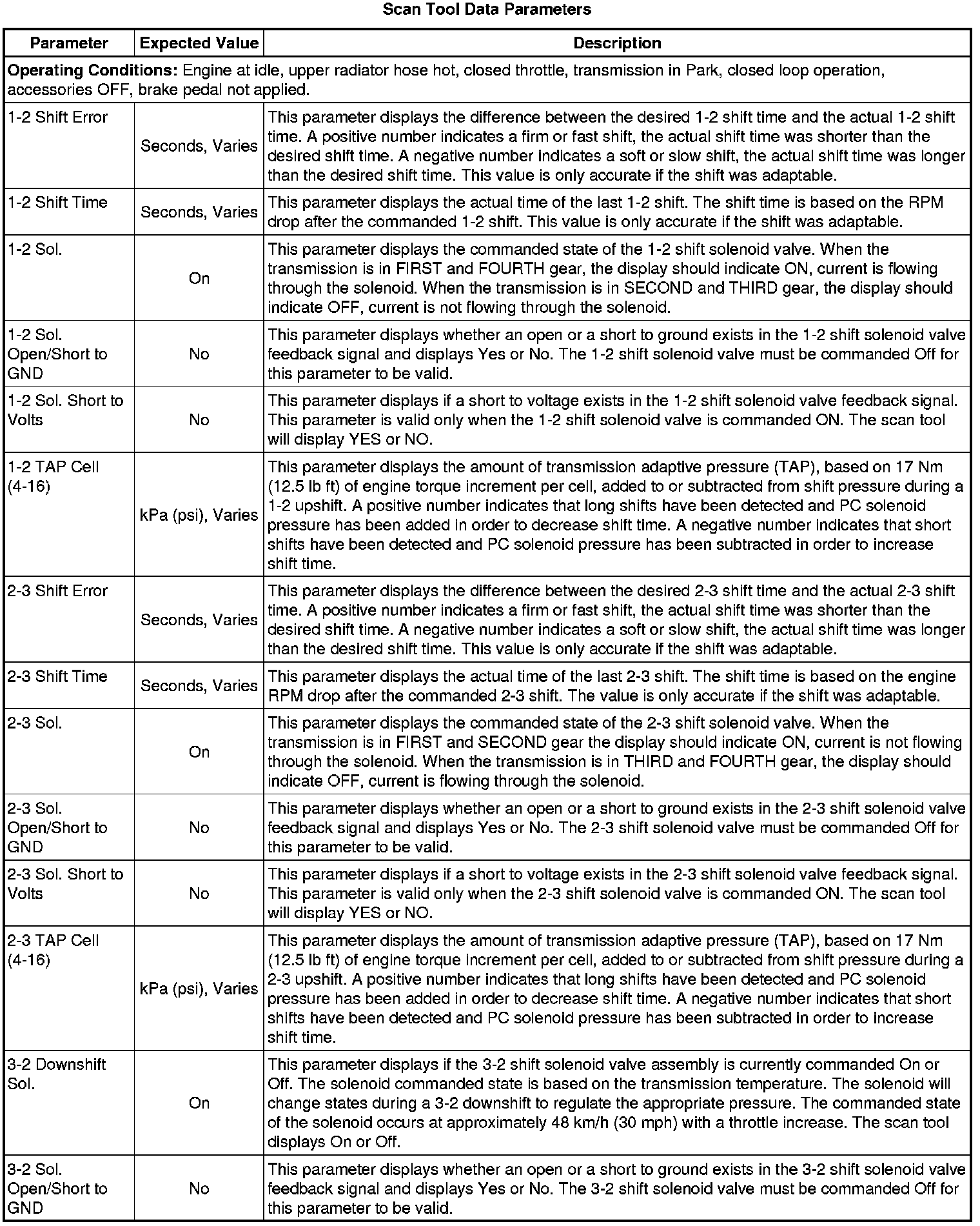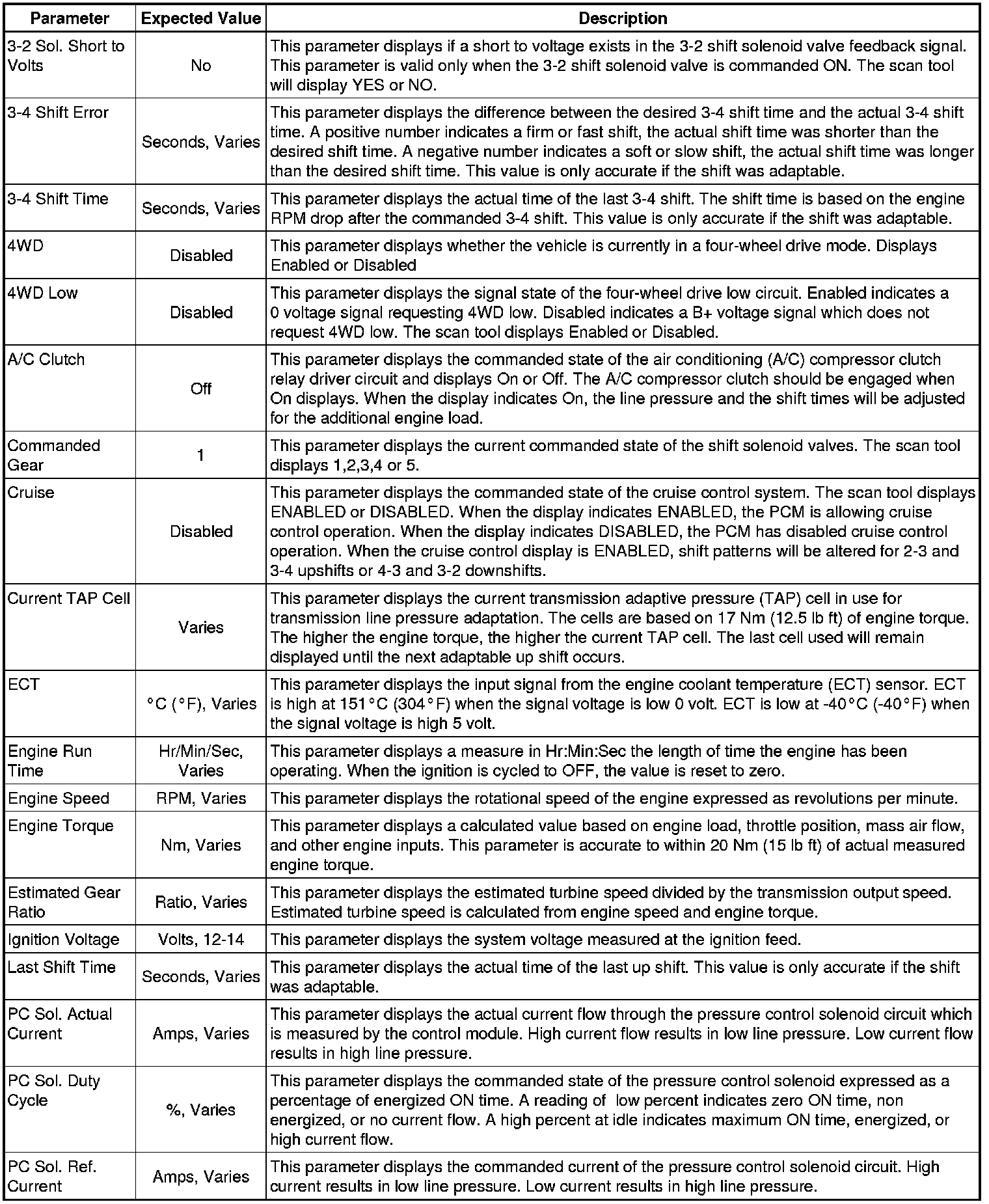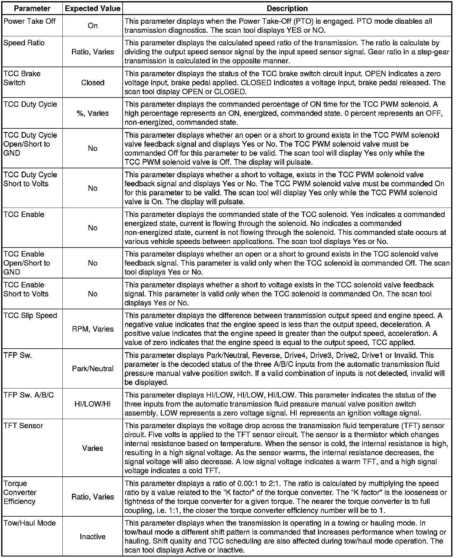 The Transmission Control Module Scan Tool Data List contains all transmission related parameters that are available on the scan tool. The list is arranged in alphabetical order. A given parameter may appear in any one of the data lists, and in some cases may appear more than once, or in more than one data list in order to group certain related parameters together.