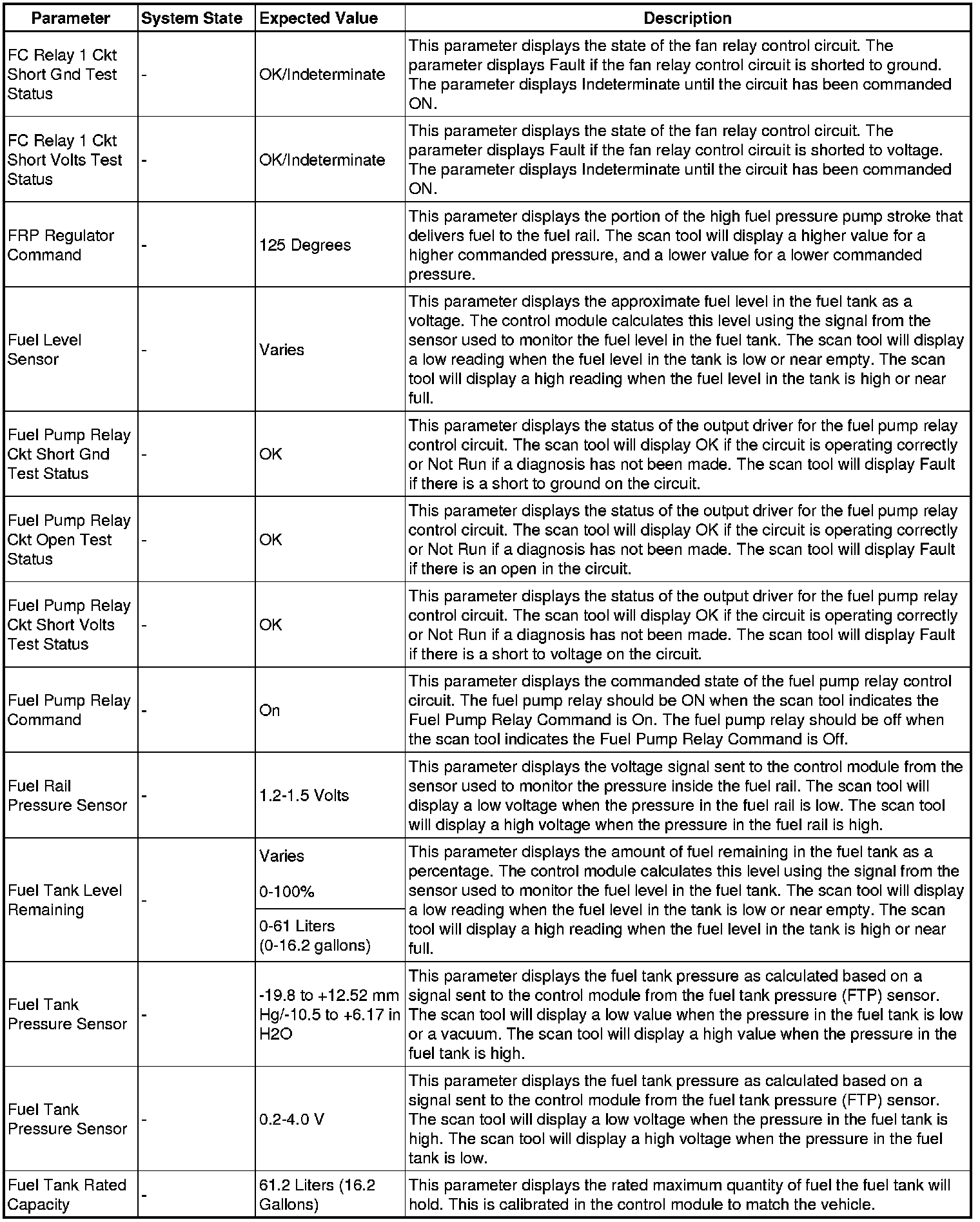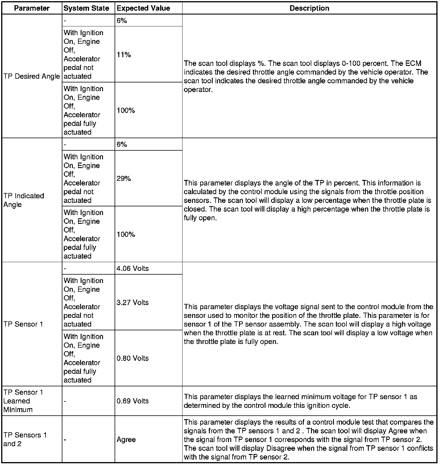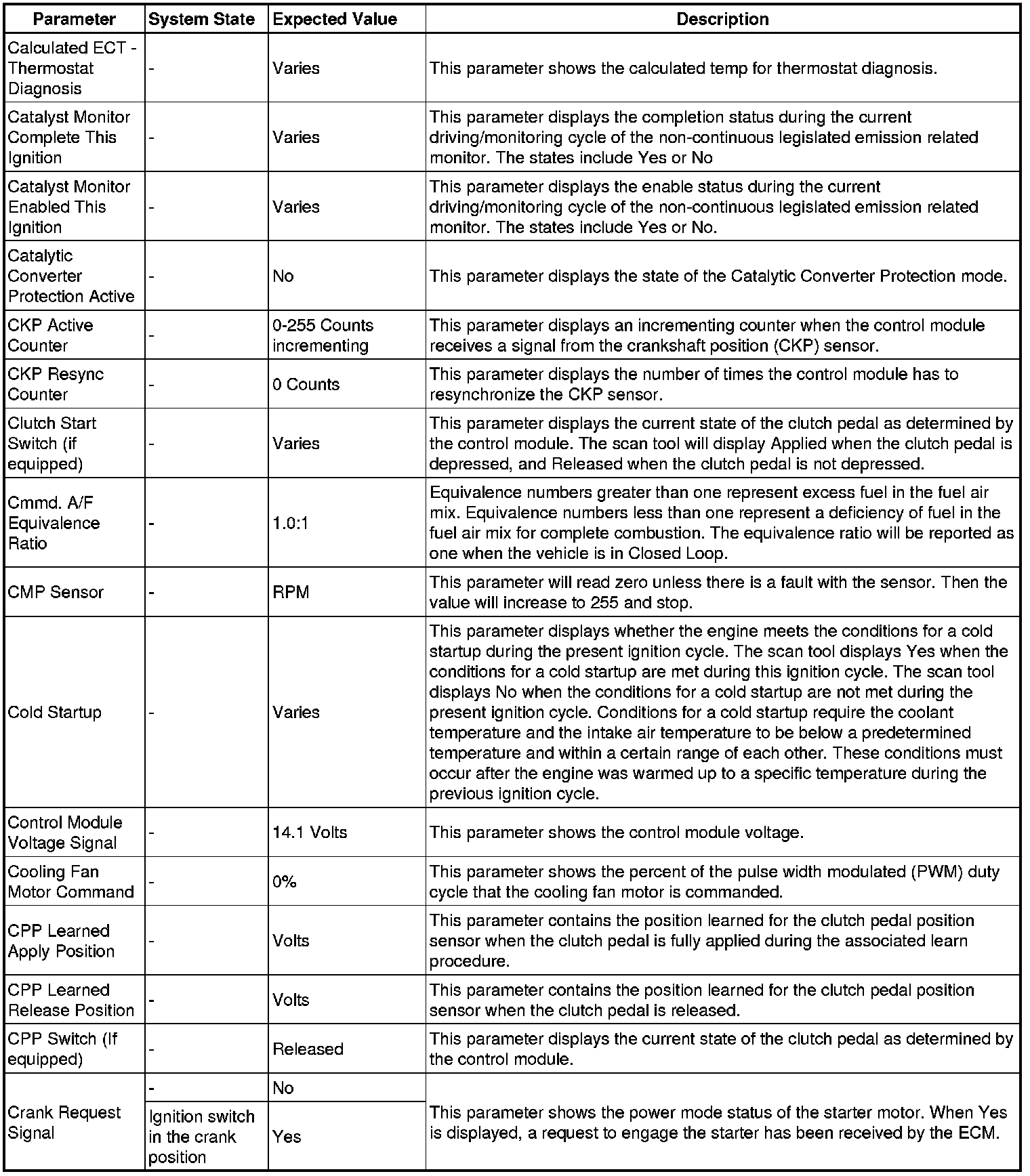 Only the parameters listed below are referenced in this service manual for use in diagnosis. If all values are within the typical range described below, refer to Symptoms - Engine Controls (- Symptoms - Engine Controls) for the 2.0L engine for diagnosis.