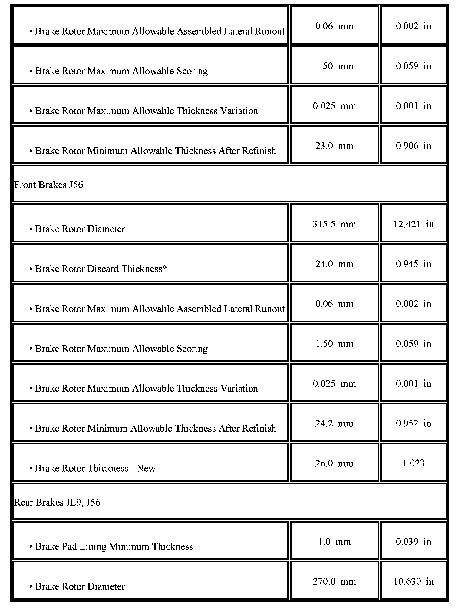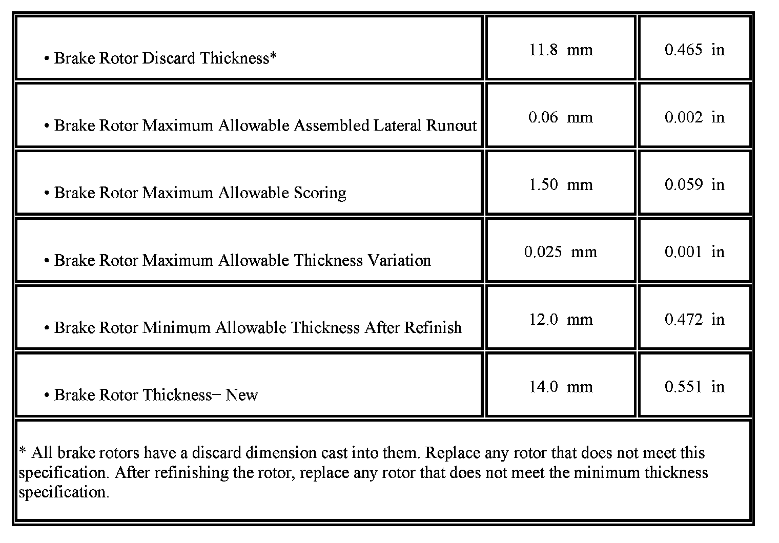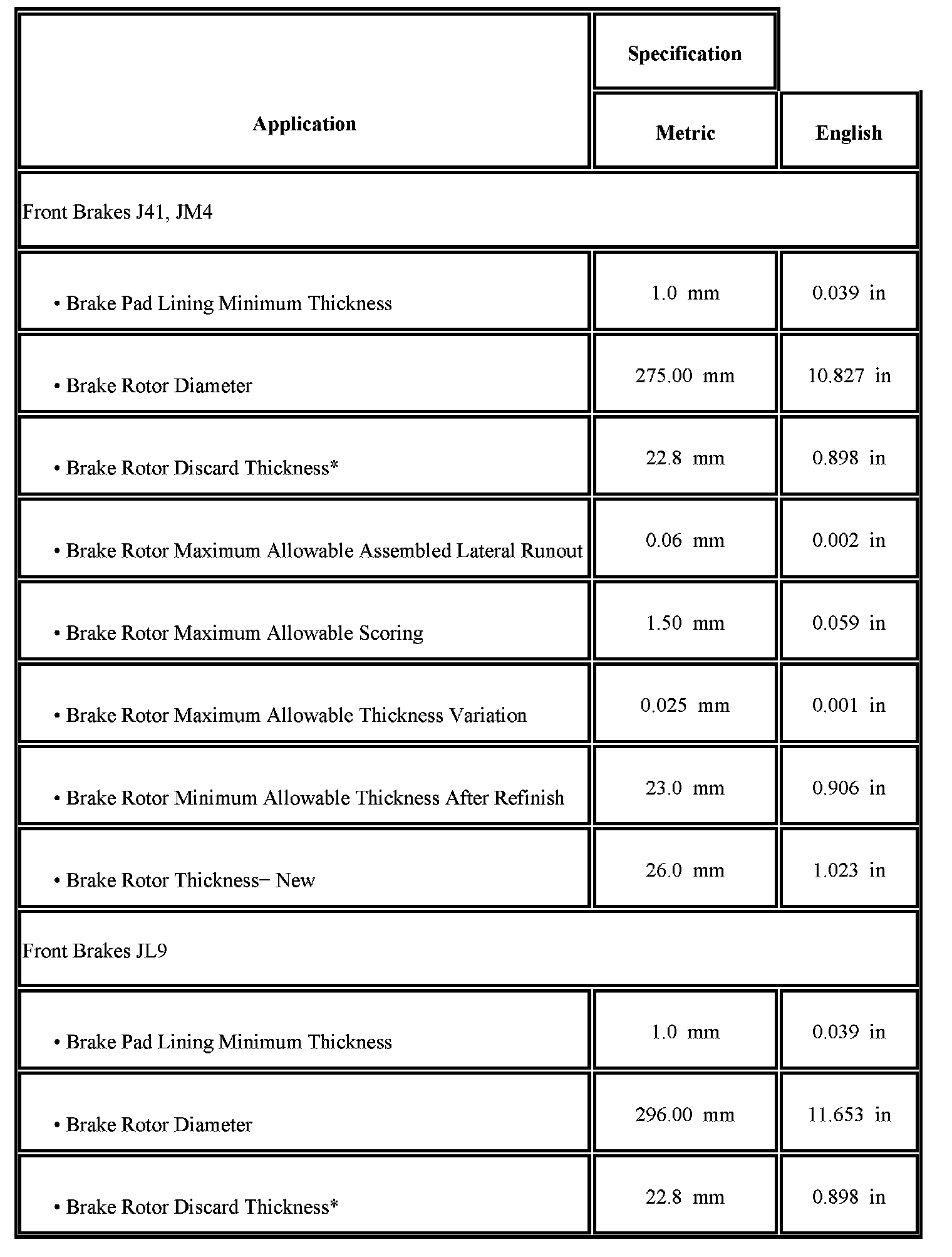 Disc Brake Component Specifications