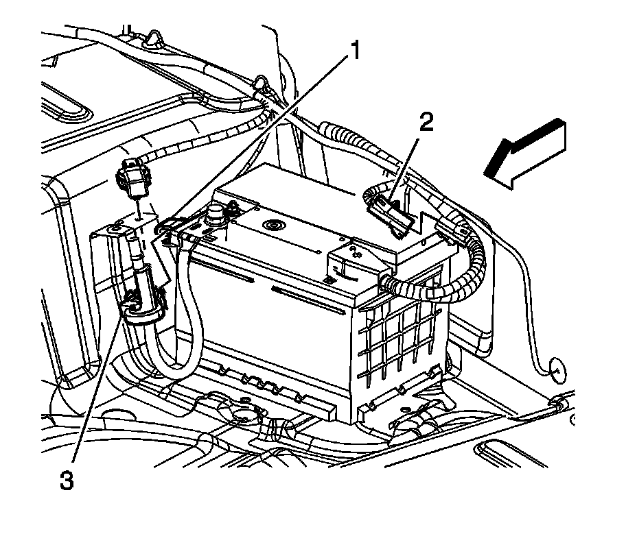 2. Disconnect the body harness electrical connector (1) from the battery current sensor (3).