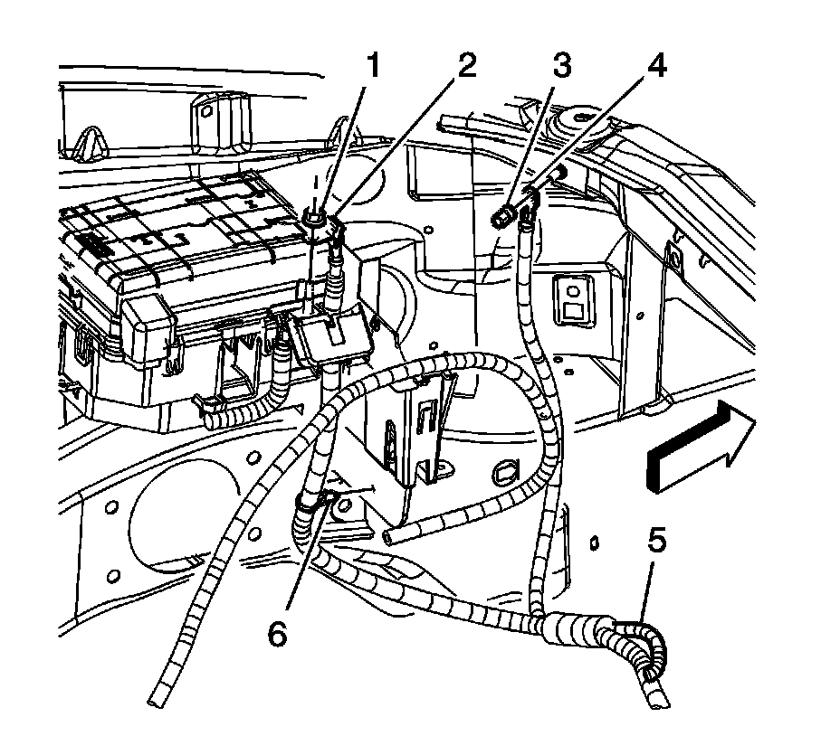 9. Remove the positive battery cable clips (3, 4) from the studs.