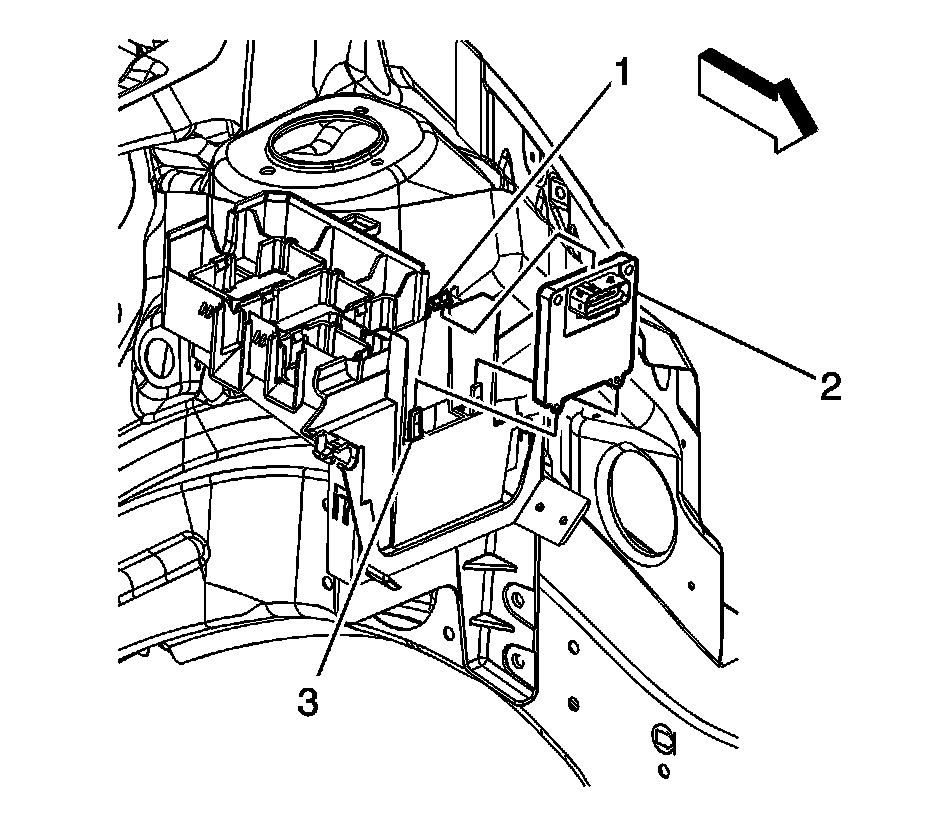 1. Place the TCM (2) into the under hood junction block bracket (3).