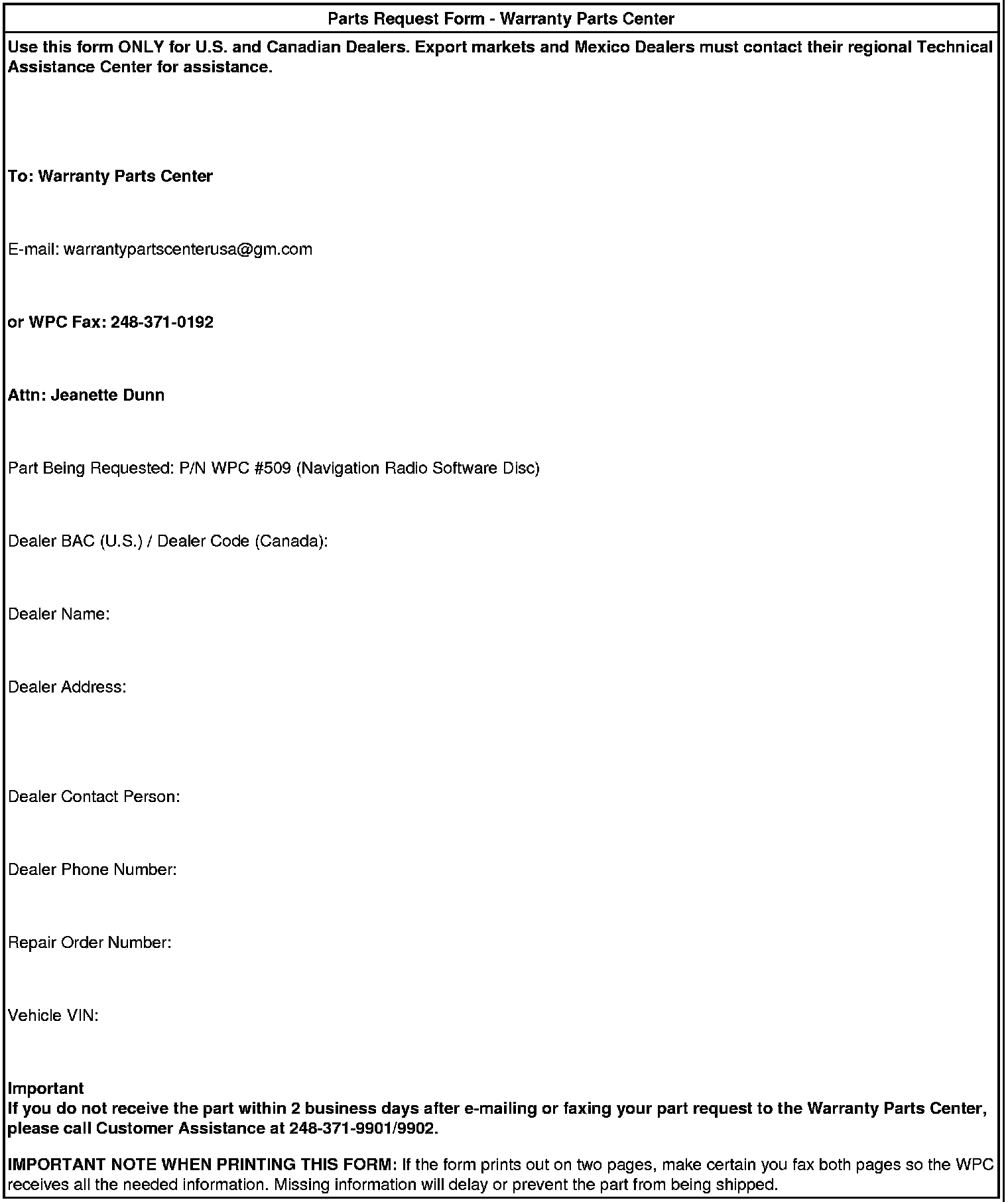 IMPORTANT NOTE WHEN PRINTING THIS FORM: If the form prints out on two pages, make certain you fax BOTH pages so the WPC receives all the needed information. Missing information will delay or prevent the part from being shipped.
