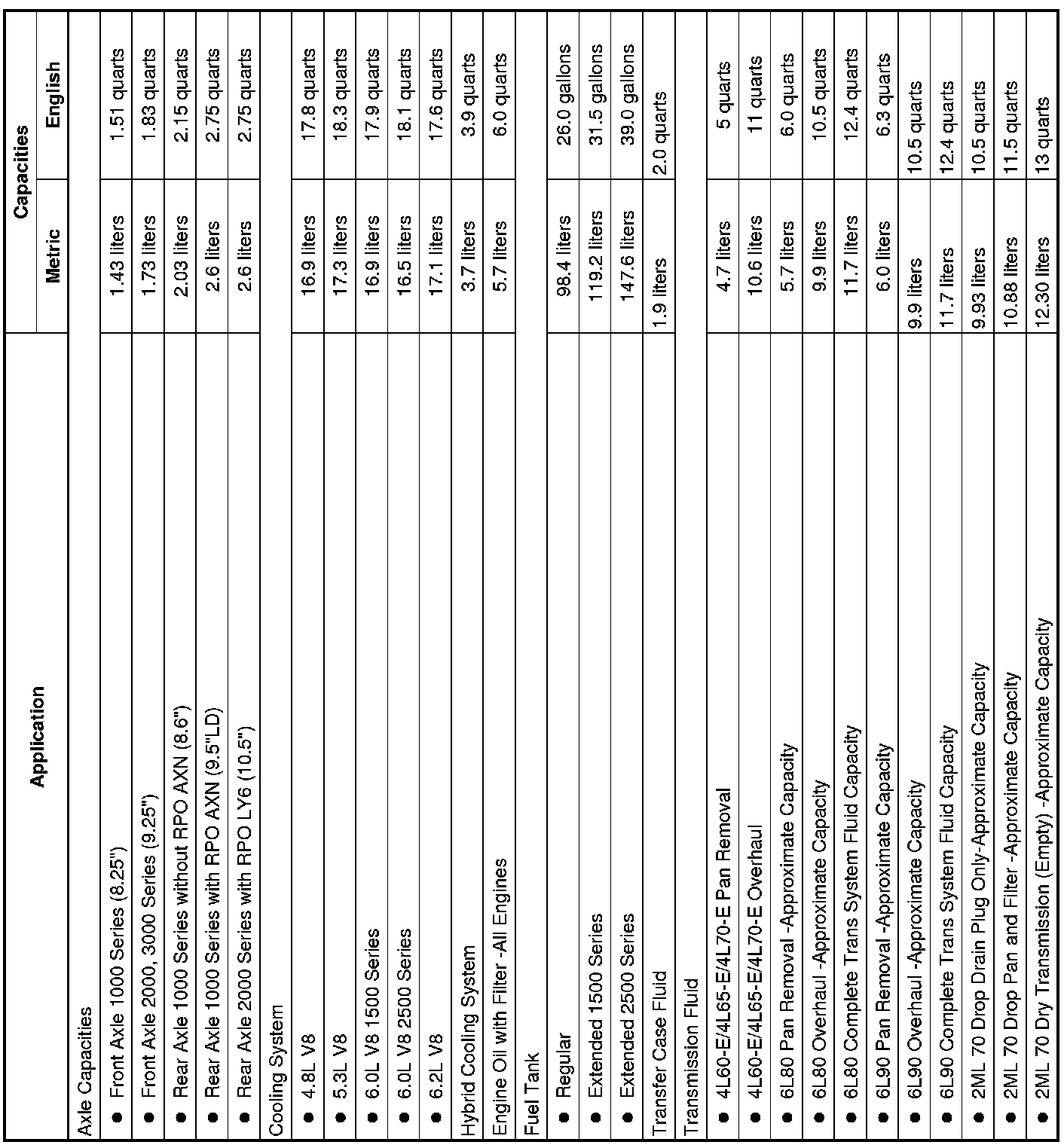 See Fluid and Lubricant Recommendations (Specifications) for more information. All capacities are approximate. When adding, be sure to fill to the approximate level, as recommended in this manual. Recheck fluid level after filling.