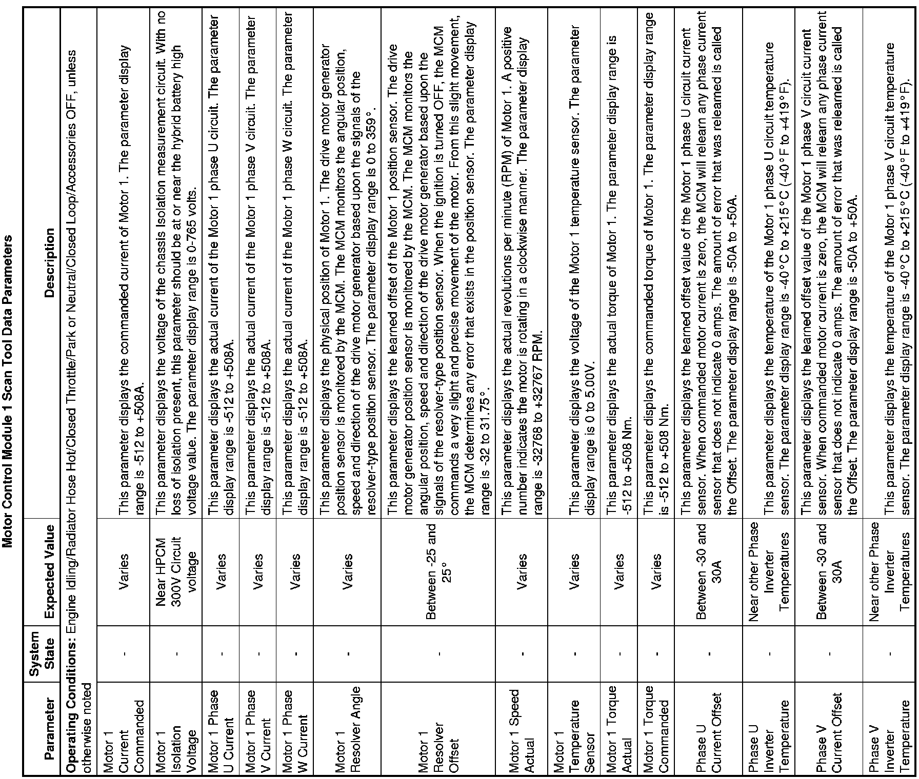 The scan tool values from a properly running vehicle may be used for comparison with the vehicle you are diagnosing. The Motor Control Module 1 Scan Tool Data Parameters list represents values that would be seen on a normally running vehicle.