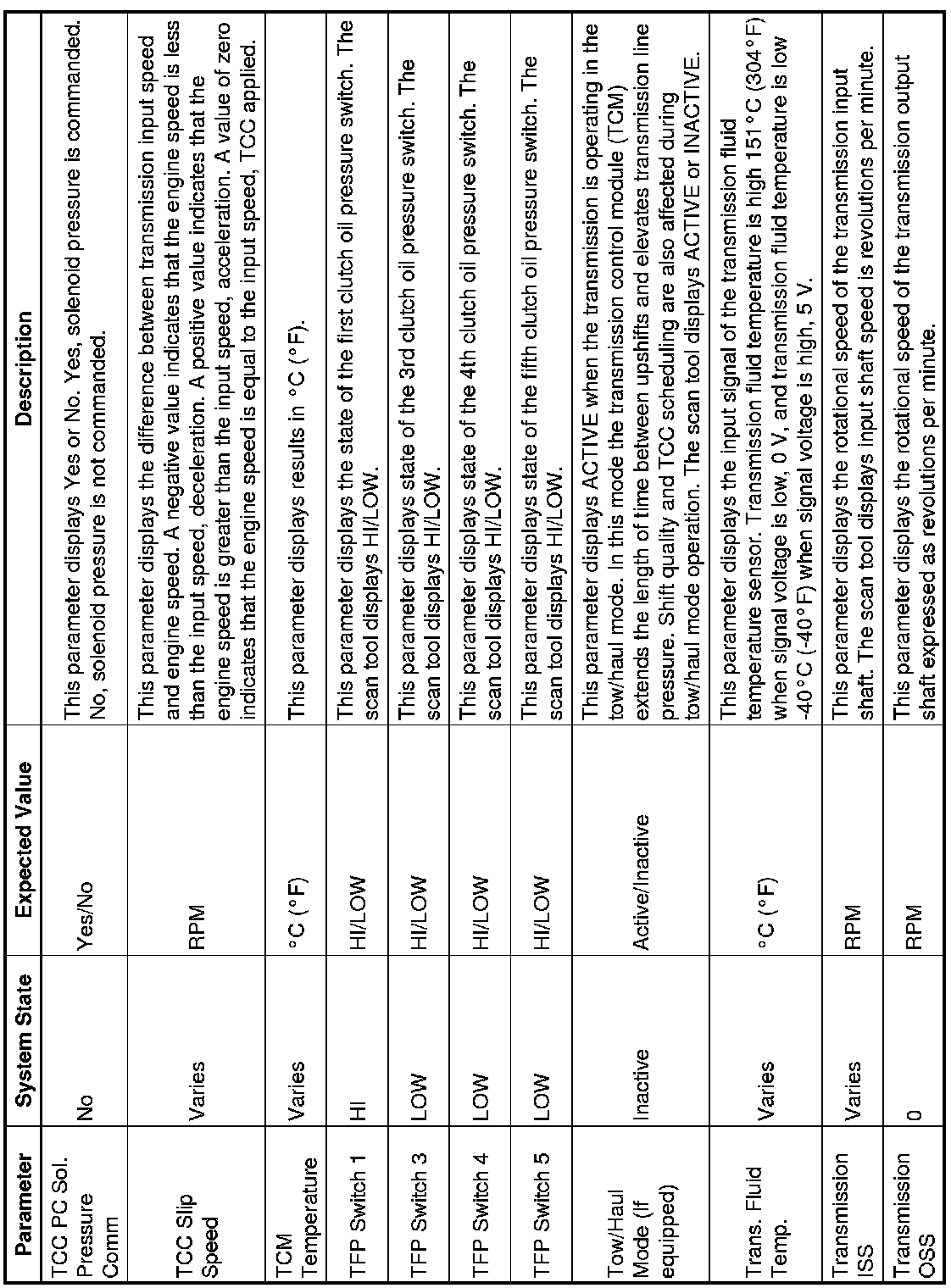 The Transmission Control Module Scan Tool Data List contains all transmission related parameters that are available on the scan tool. The list is arranged in alphabetical order. A given parameter may appear in any one of the data lists, and in some cases may appear more than once, or in more than one data list in order to group certain related parameters together.