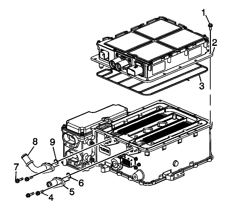 5. Install new seals (6, 9) onto the drive motor generator power inverter coolant pipes (5, 8).