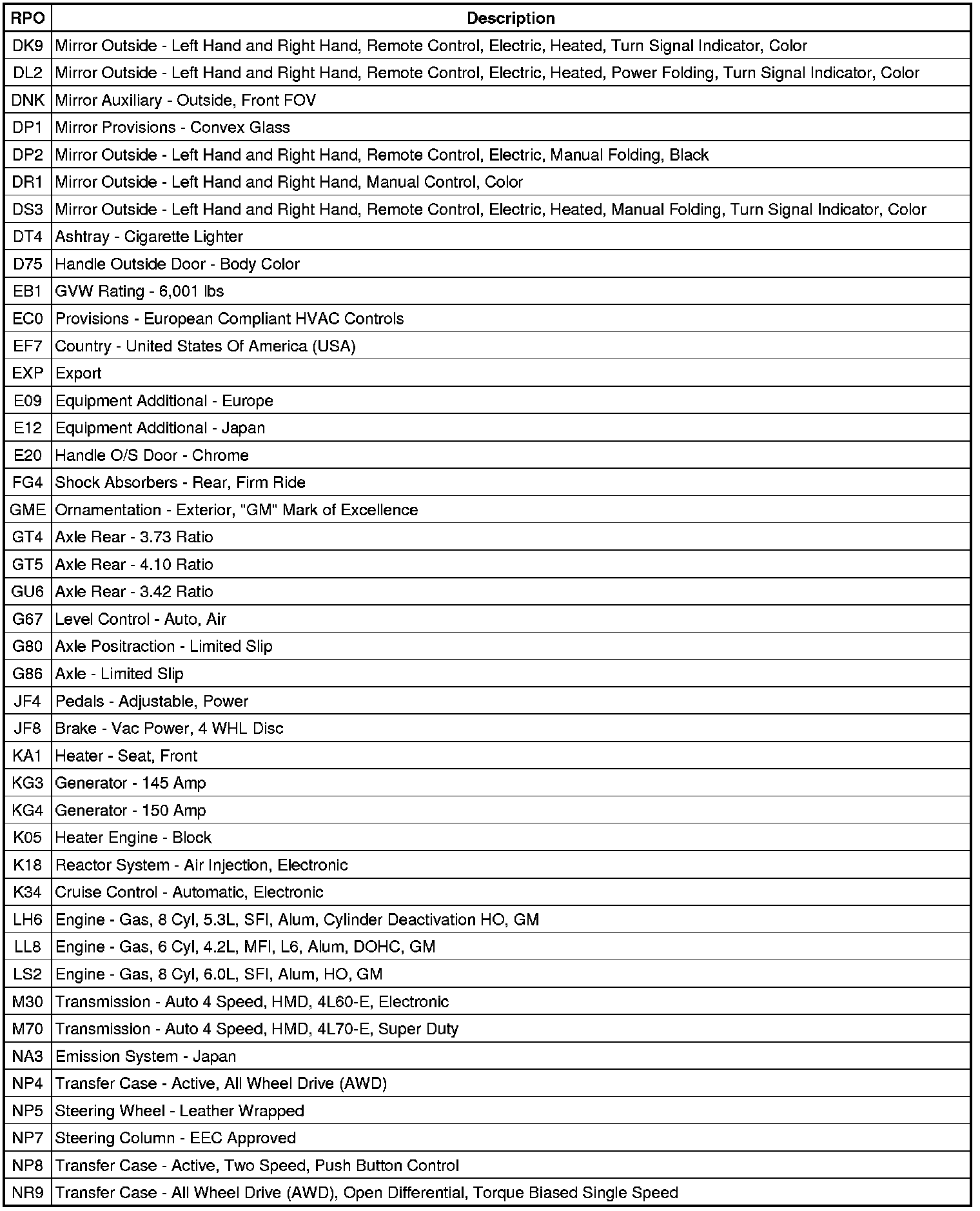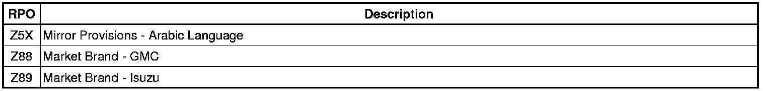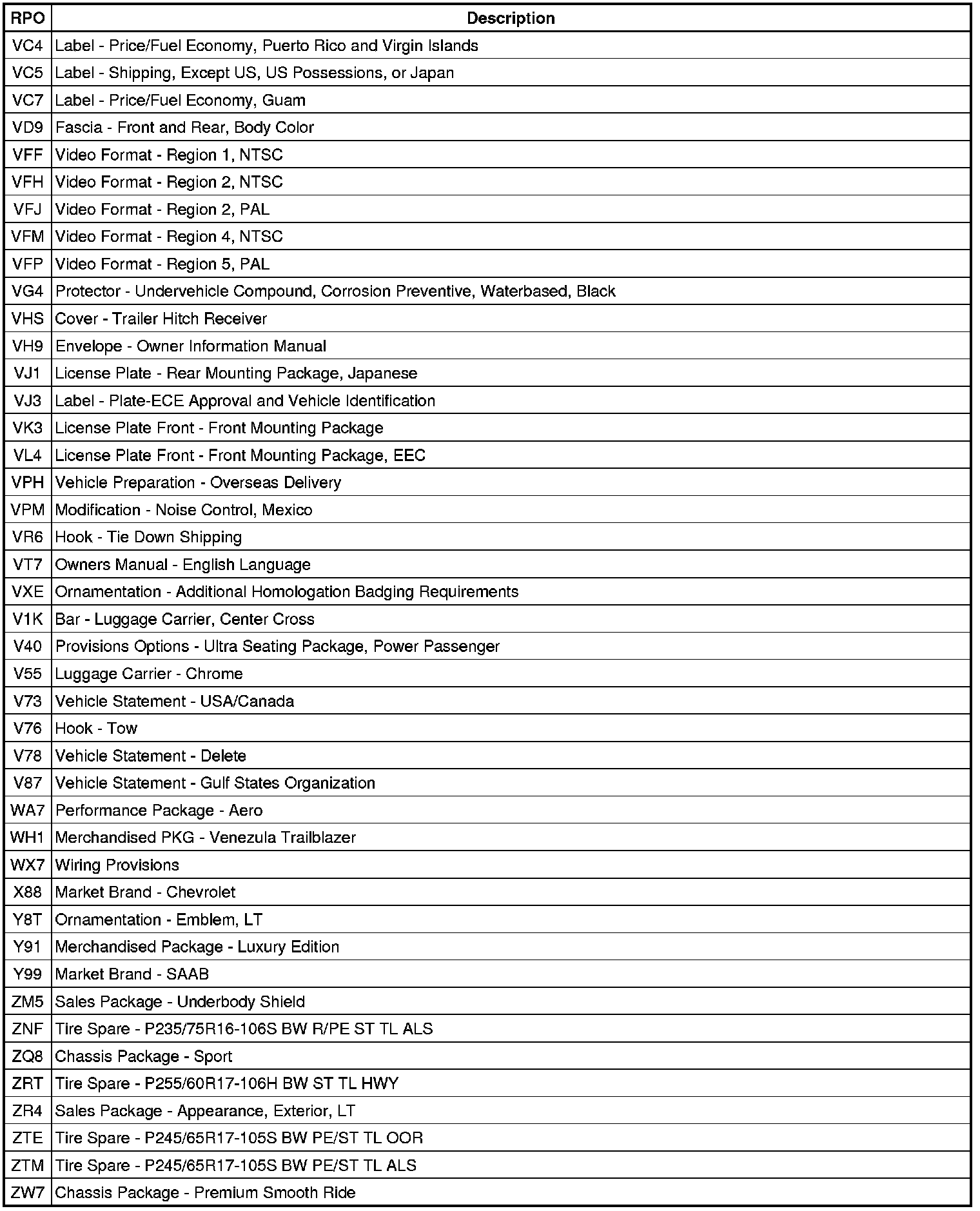 RPO Code List