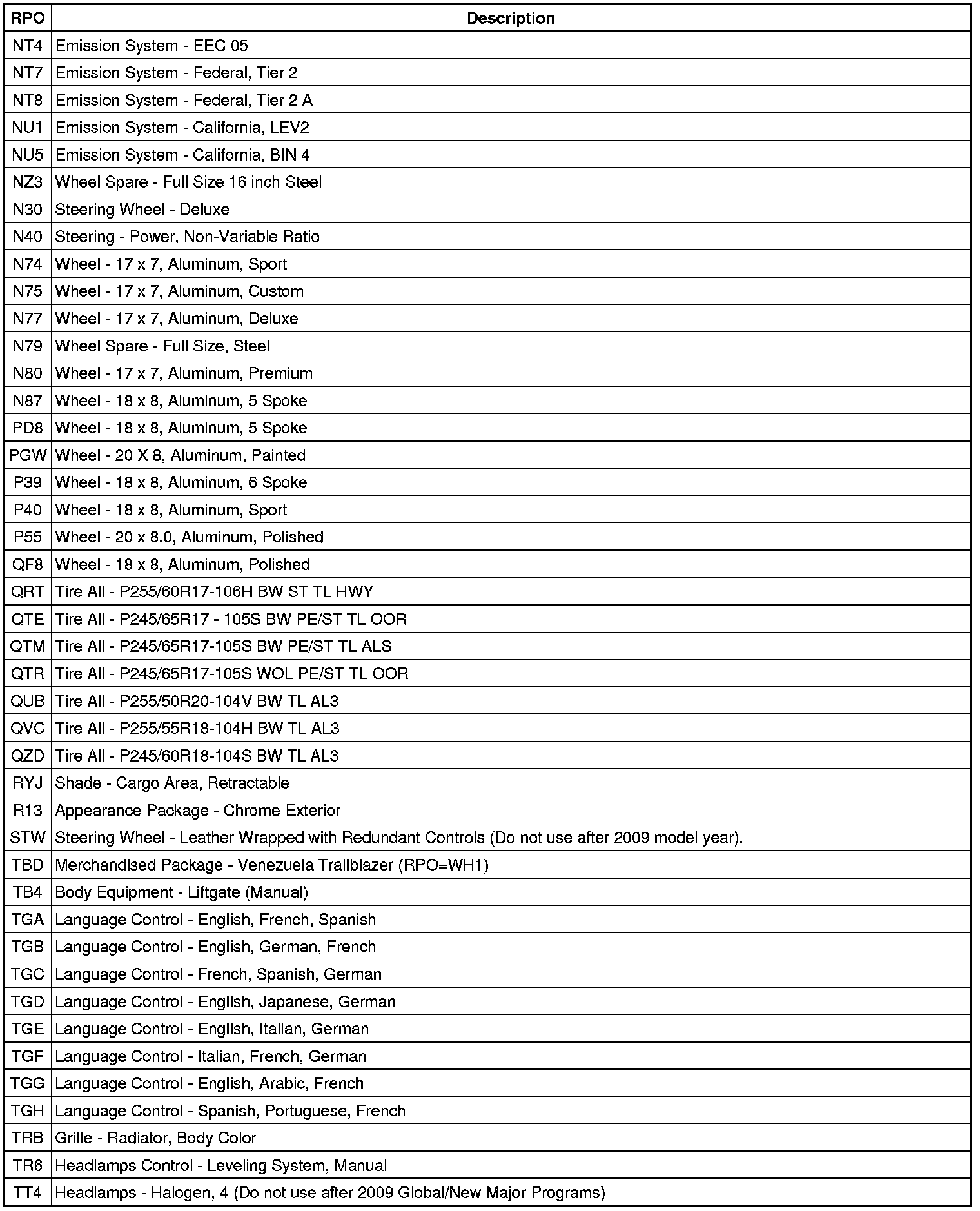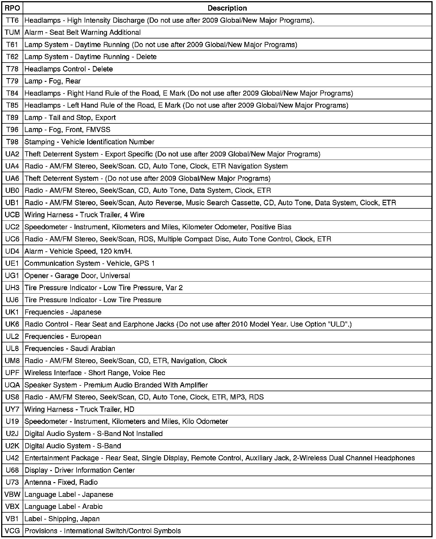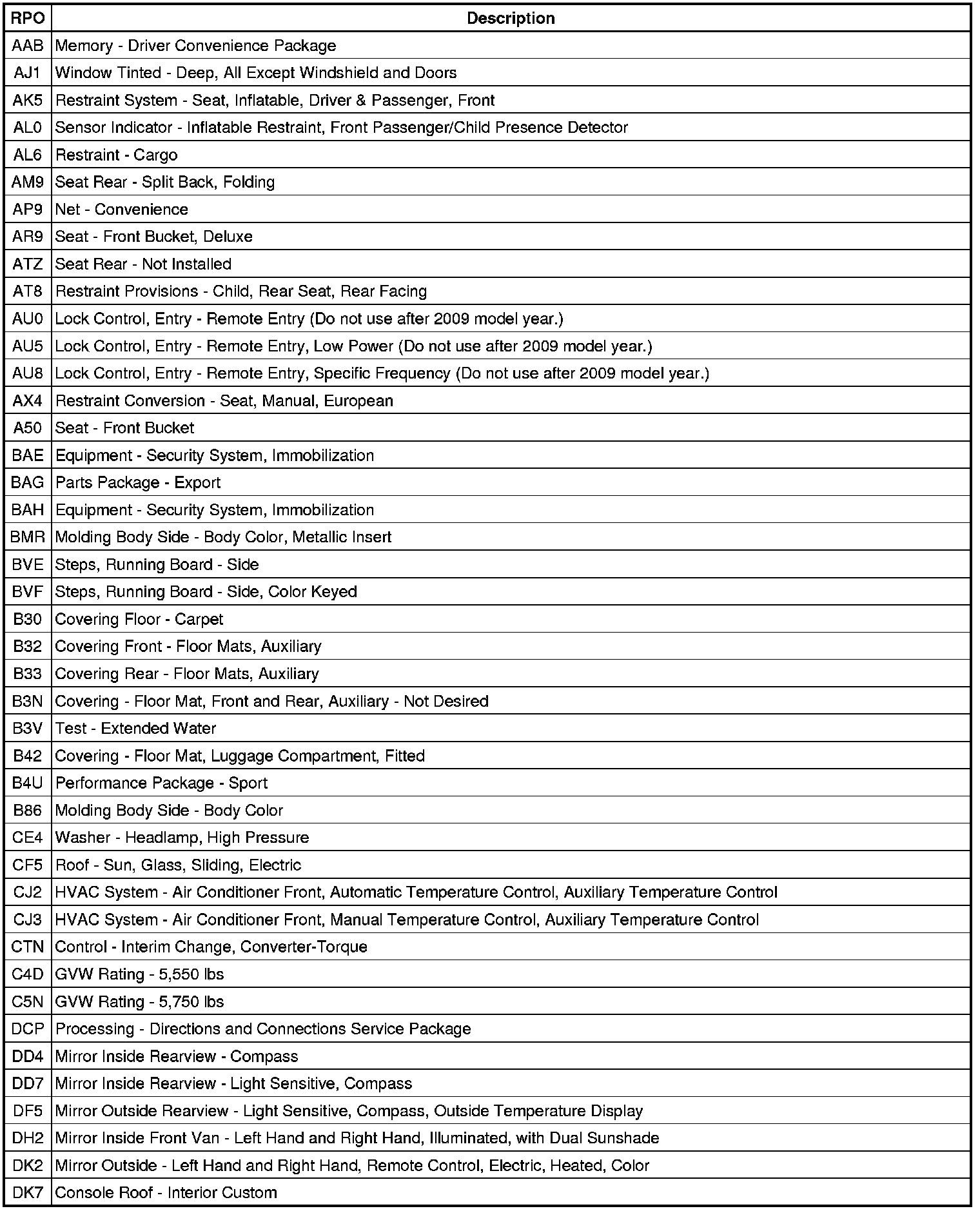 RPO Code List