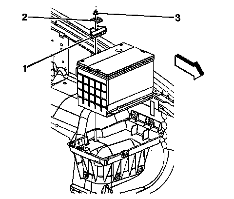 2. Install the battery hold down retainer (1), nut (3), and washer. Tighten the nut to 15 Nm (11 lb ft).
