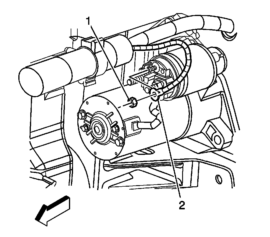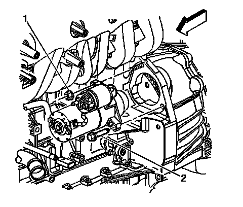 2. Install the starter motor mount bolt (2) and nut (1) to tighten to 50 Nm (37 lb ft).