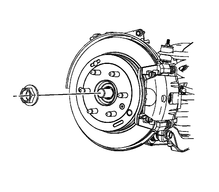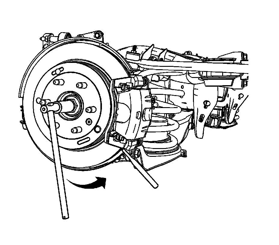 19. Insert a brass drift or punch in the brake rotor so that the brass drift or punch rest against the brake caliper mounting bracket.