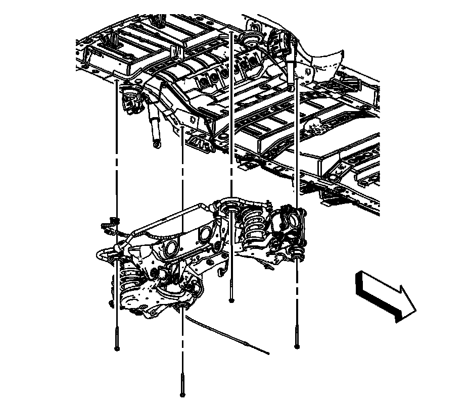 7. With the rear suspension crossmember mounted on a suitable stand and with the aid of an assistant, carefully lower the vehicle or raise the rear suspension crossmember into location on the vehicle.