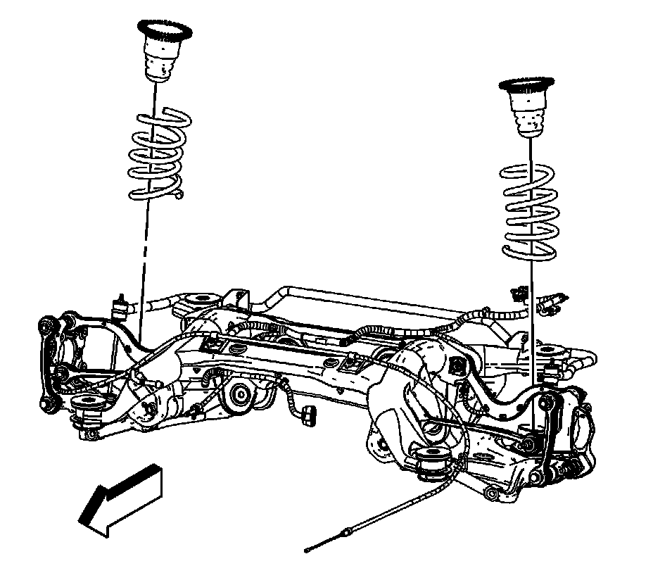 6. Install the jounce bumpers and springs to the rear suspension crossmember. Refer to Rear Spring, Insulator, and Jounce Bumper Replacement (Rear Suspension Coil Spring) for proper spring installation.