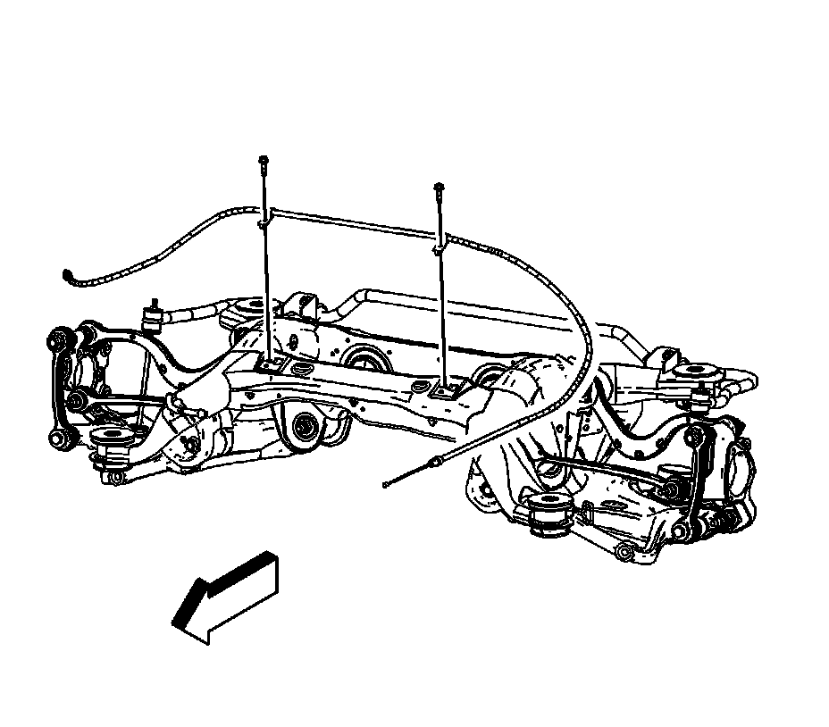 22. Remove the right park brake cable retaining bolts from the rear suspension crossmember.