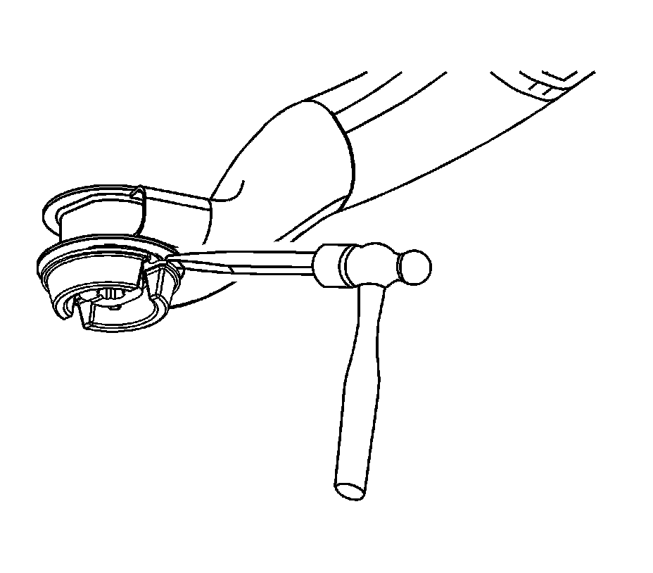 12.Remove the lower mount using a flat chisel. Begin extracting the mount by guiding the wedge of the chisel tip between the mount flange lip and the suspension crossmember.