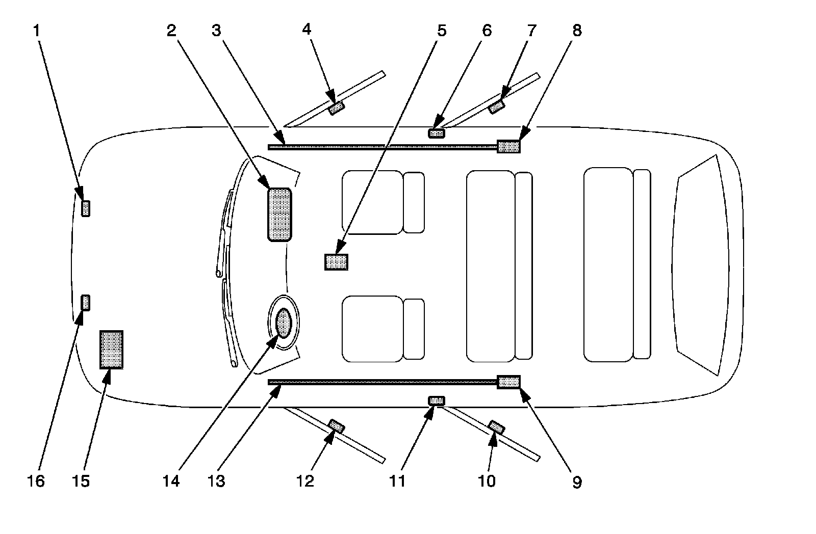 13 - Roof Rail Air Bag - Left-Located under the headliner, extending from the driver front windshield pillar to the driver rear windshield pillar