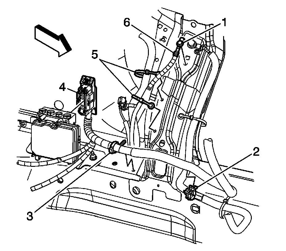 4. Install the battery negative cable extension cable clip (4) to the front compartment side rail.