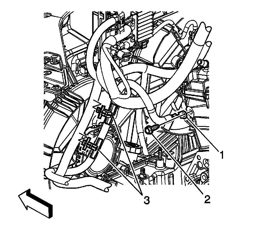 7. Remove the battery negative cable extension cable clip (3) from the left upper engine compartment support bracket.