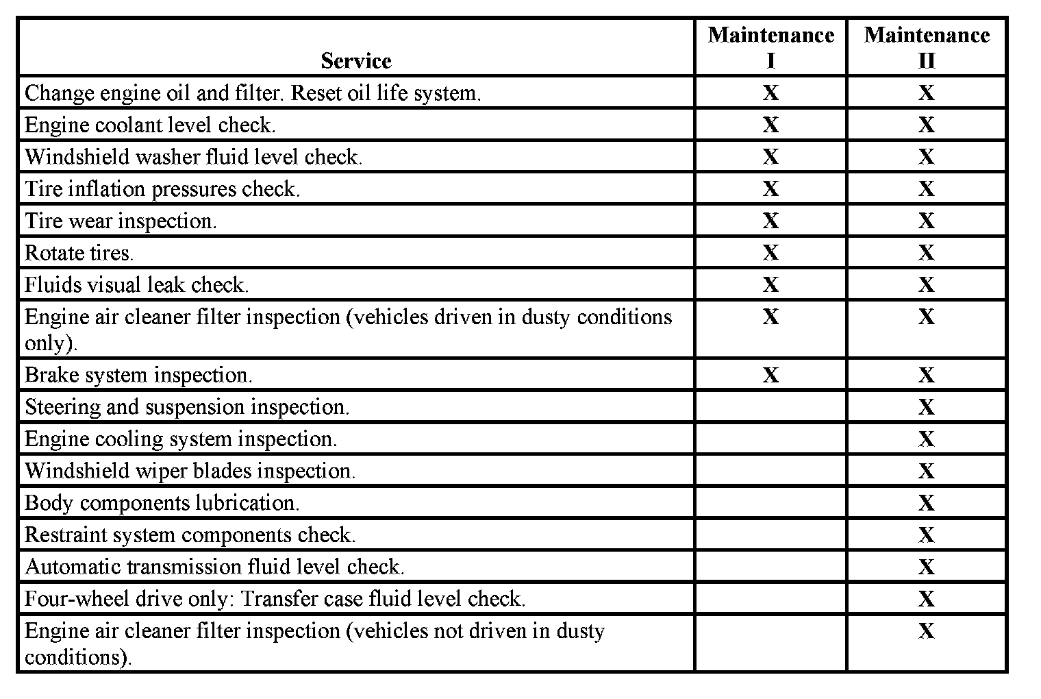 When the Change Oil message displays, certain services, checks, and inspections are required. The services described for Maintenance I should be performed at every engine oil change. The services described for Maintenance II should be performed when: